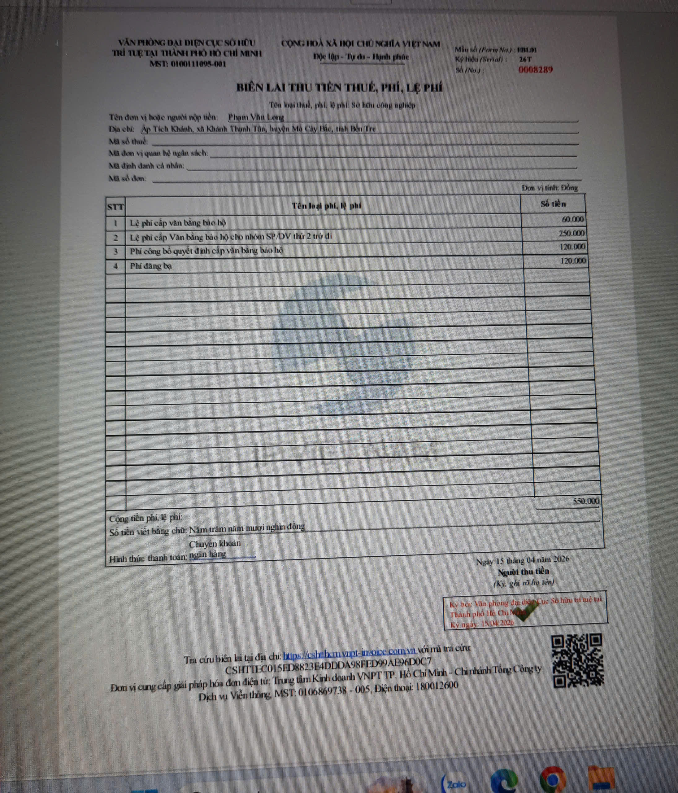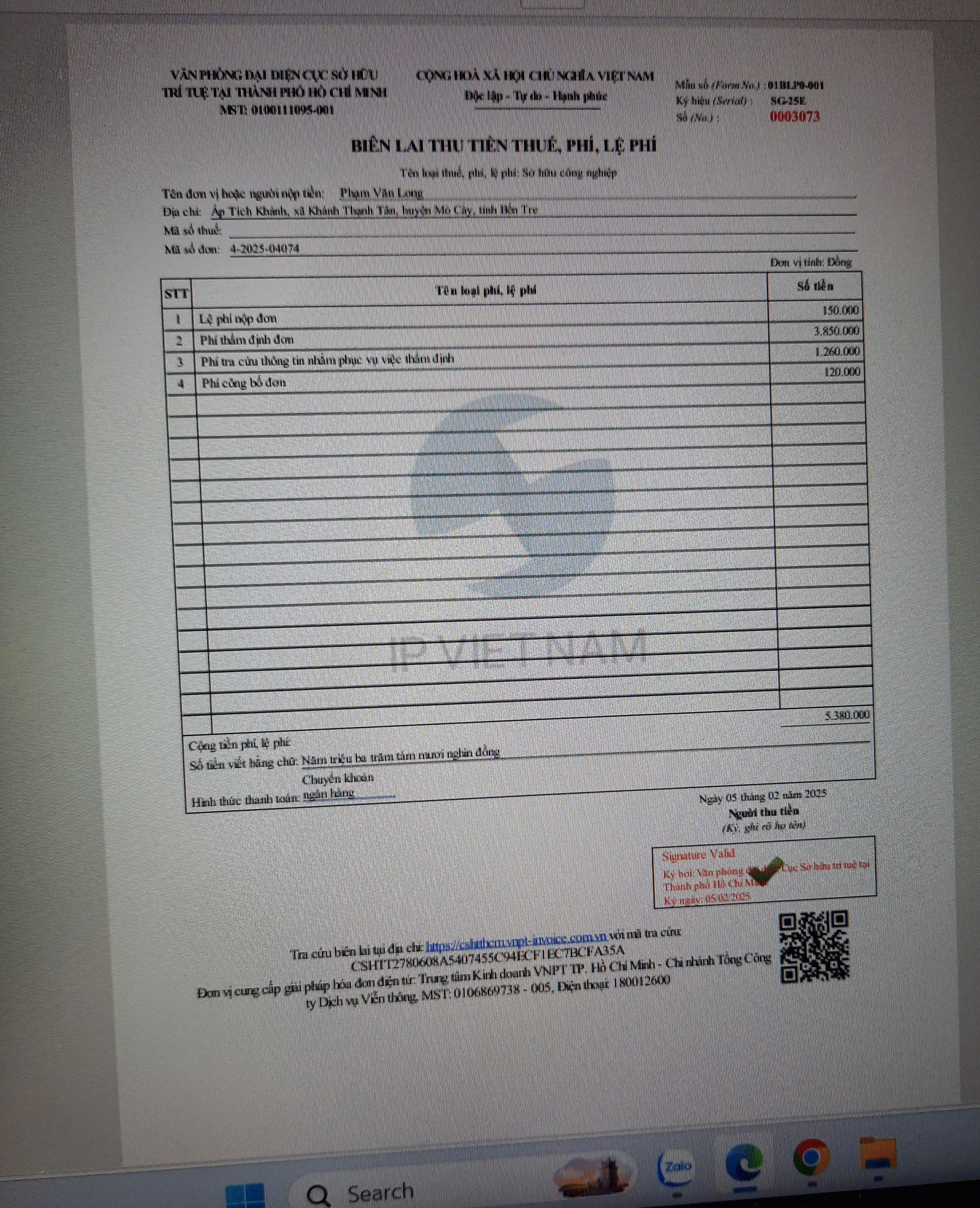 Đến nay 29 - 04 - 2026, ThS PHẠM VĂN LONG; Công Ty Phạm Gia Home đã hoàn tất đóng các khoản phí lệ phí cấp văn bằng bảo hộ cho Đơn Số: VN4 - 2025 - 04074, đơn đăng ký bảo hộ nhãn hiệu VIN HOME - WIN HOME cho nhóm hàng hóa/dịch vụ: 09, 12, 13. 15, 17 và nhóm 19. Đây là văn bằng thứ 08 được Cục SHTT cấp bảo hộ cho nhãn hiệu.